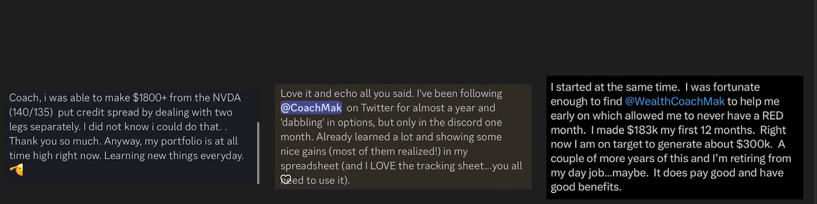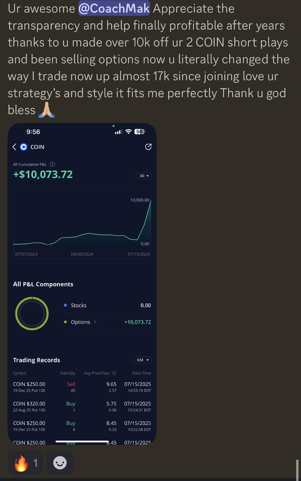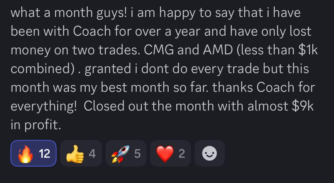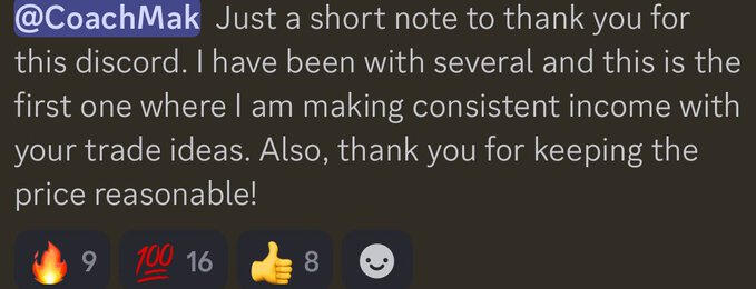 ✅ Access to Coach Mak's personal options trades✅ Real-time trade alerts and position updates✅ Weekly income generation strategies✅ Live webinars with Q&A sessions✅ Comprehensive library of trading eBooks✅ Regular technical analysis and market insights✅ Option flow data and detailed trading guides✅ Active Discord community support