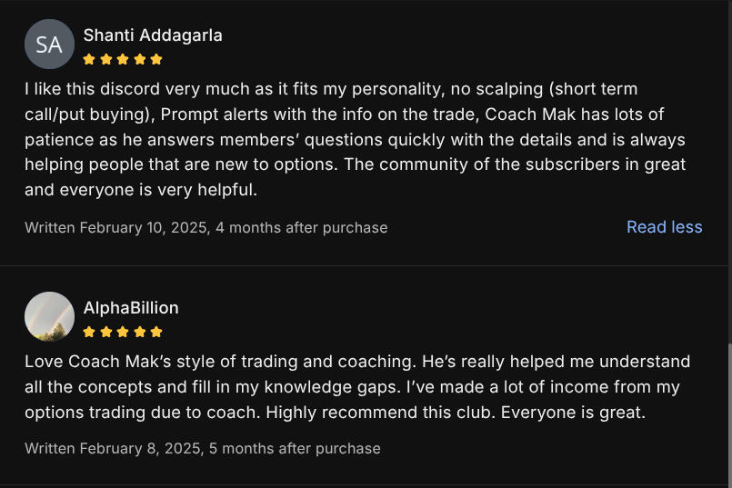 ✅ Access to Coach Mak's personal options trades✅ Real-time trade alerts and position updates✅ Weekly income generation strategies✅ Live webinars with Q&A sessions✅ Comprehensive library of trading eBooks✅ Regular technical analysis and market insights✅ Option flow data and detailed trading guides✅ Active Discord community support
