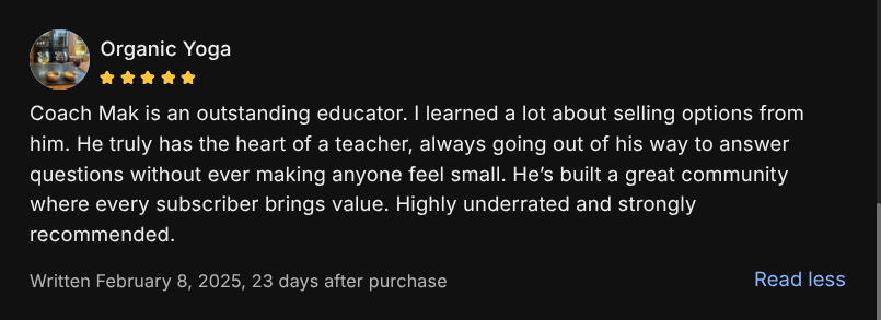 I'm not your typical finance guru. I don't wake up at 4:30am or own a Lambo. I'm a 44-year-old dad who went from -$100K debt to $7M+ net worth through systematic options trading.My approach is simple: "Day trading stocks and options is a job. Selling options is a business."I've crafted Mak's Money Maker Club to empower traders with proven strategies and a supportive community. My personal options trades, educational webinars, and technical analysis resources are designed to help you achieve consistent income and trading success.Results speak for themselves: I generate $8-10K weekly premiums in just 3-5 hours per week, and I want to show you how to do the same.